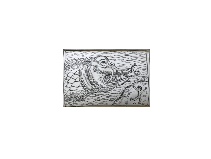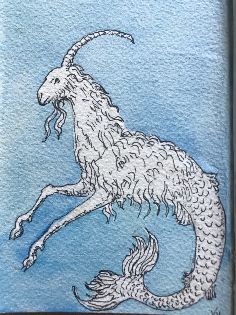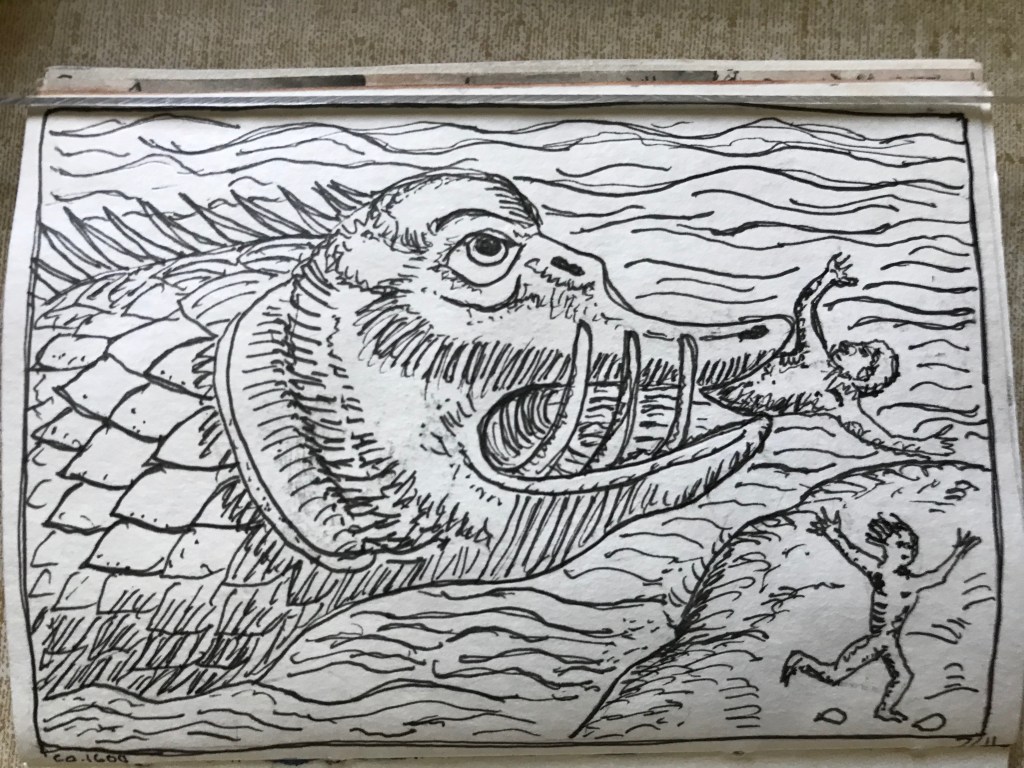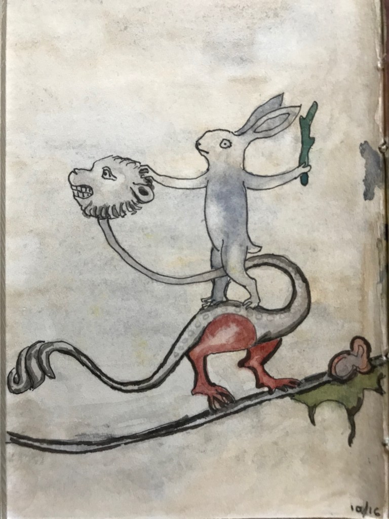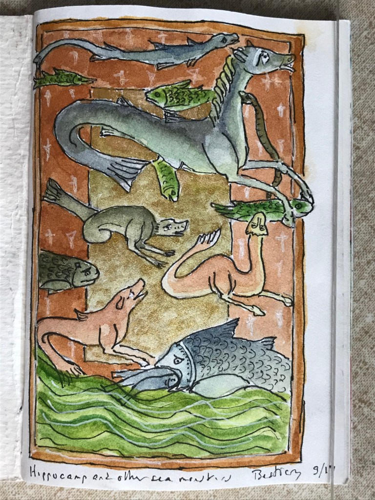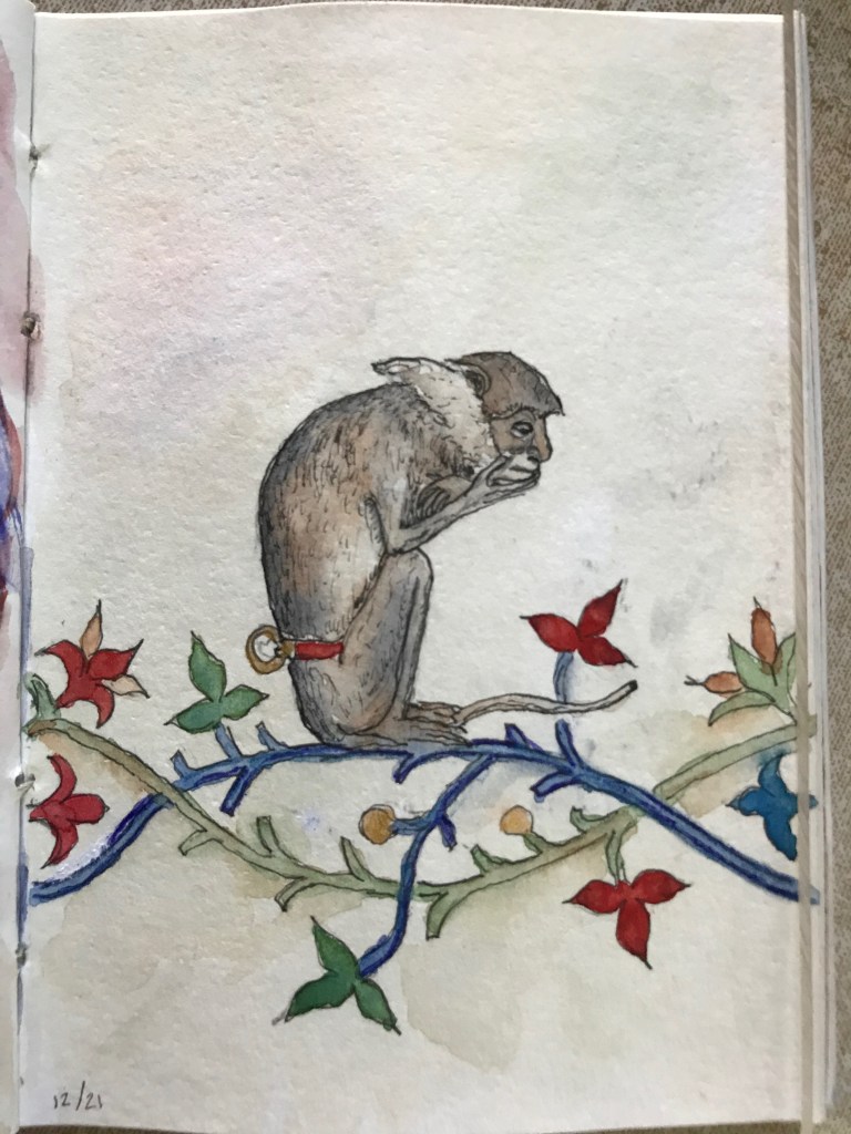 My copies of illustrations from medieval manuscripts. I, um, only kept track of the source of two of these: the contemplative monkey is from the Breviary of Marie of Savoy, 1430; the basilisk with the dog? on his back is from the Aberdeen Bestiary folio 66.
