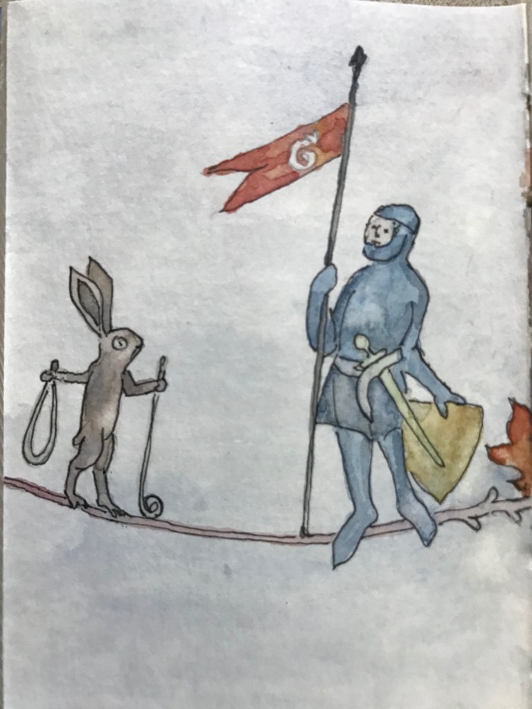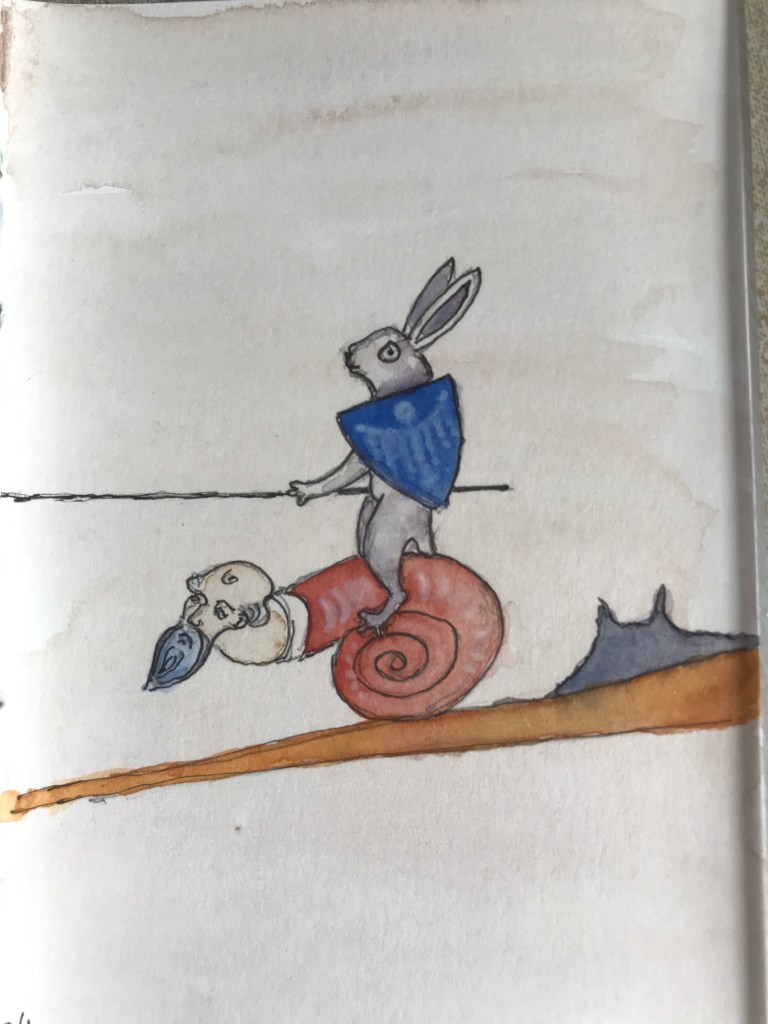I got obsessed with copying these for a while…some bored monk had a real admiration for rabbits. These are from The Pontifical of Renaud de Bar (France, Metz or Verdun, c. 1303-1316). More details here.
